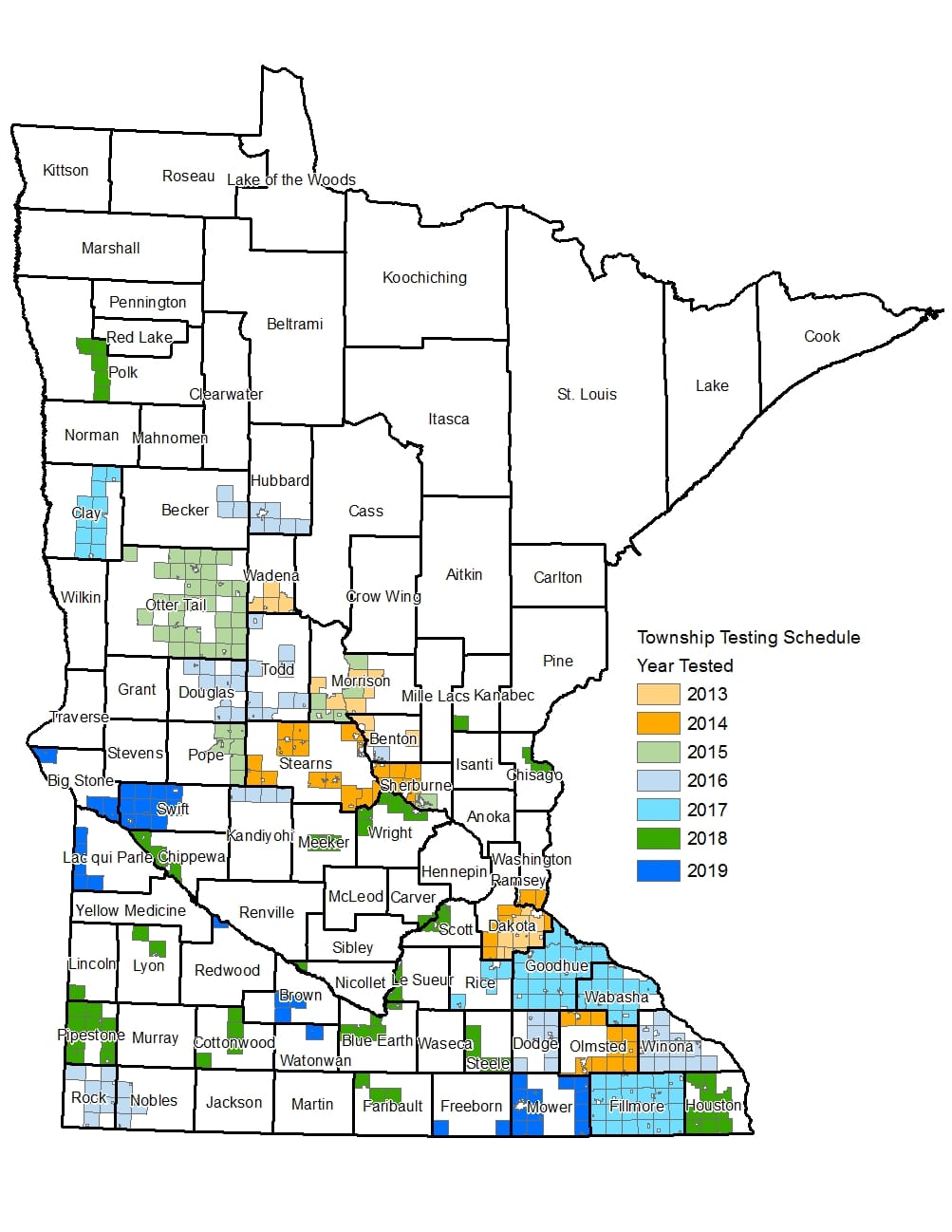 Minnesota Department of Agriculture (MDA) significantly revised the Nitrogen Fertilizer Management Plan (NFMP) in March 2015 after working extensively with an advisory committee. The plan calls for an assessment of nitrate-nitrogen concentrations in private wells at the township scale. MDA has identified townships across the state that are vulnerable to groundwater contamination and have significant row crop production. The schedule of testing for these priority townships is included on MDA’s Township Testing Schedule and Results page. Townships that are not highlighted may also be considered if there is data to suggest there is a local groundwater problem.